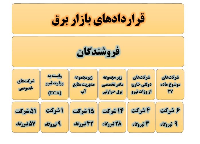 در بازار برق ایران، بیش از 150 نیروگاه فعالیت دارند. در طول فرآیند تجدیدساختار سیستم قدرت، بسیاری از نیروگاهها خصوصی شده اند و این فرآیند با ساخت نیروگاههای با مالکیت بخش خصوصی ادامه دارد.