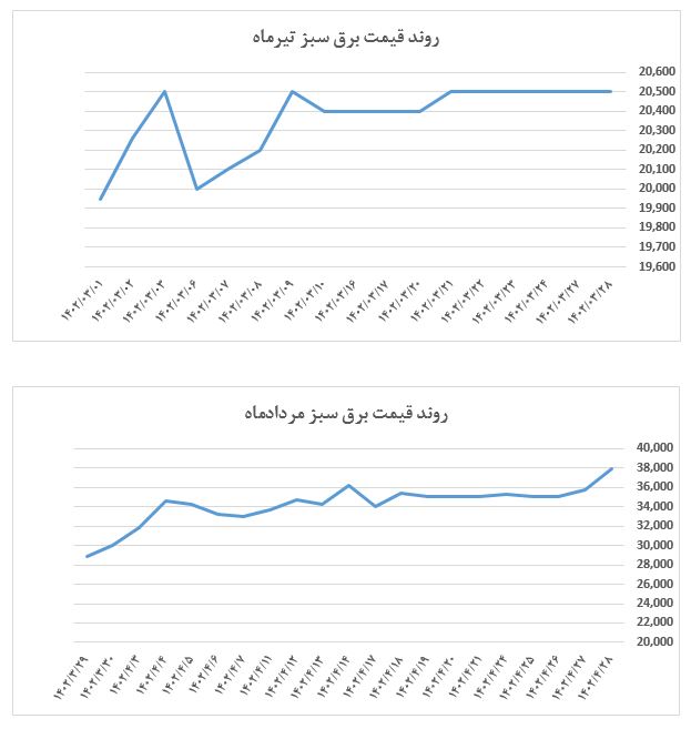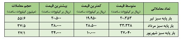 در جدول زیر متوسط قیمت، بیشترین قیمت، کمترین قیمت و حجم معاملات در هر یک از نمادهای معاملاتی آورده شده است. داده های معاملات نشان می دهد که بیشترین حجم معاملات در تیرماه انجام گرفته و بیشترین قیمت برای مرداد ماه بوده است و کمترین قیمت برای برق سبز شهریور می باشد.