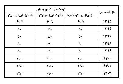 در جدول زیر قیمت سوخت نیروگاهی در سالهای اخیر آورده شده است.