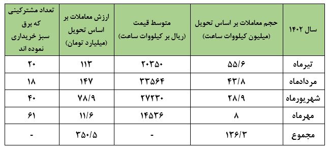 بر این اساس مقدار 8 میلیون کیلووات ساعت انرژی برای تحویل مهرماه 1402 در تابلوی سبز بورس انرژی معامله شده که به طور متوسط مقدار ظرفیت معامله شده برای تحویل این ماه معادل 11121 کیلووات در هر ساعت در طول ماه بوده است. 6849 کیلووات از ظرفیت مورد معامله برای مصرف در مهر ماه سال جاری توسط مشترکان زیر مجموعه شرکتهای برق منطقه ای و مابقی (4272 کیلووات) توسط مشترکان زیر مجموعه شرکتهای توزیع نیروی برق خریداری شده است.
