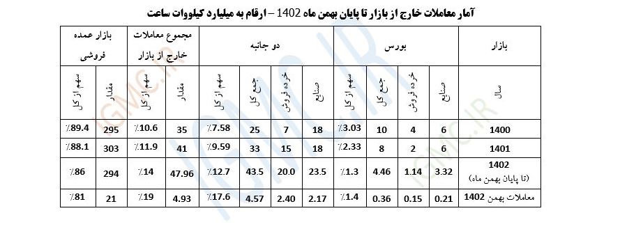 بر اساس گزارش معاونت بازار برق شرکت مدیریت شبکه برق ایران، مشترکان صنعتی بالای یک مگاوات به میزان 4/46 میلیارد کیلووات ساعت از طریق بورس انرژی و 43/5 میلیارد کیلووات ساعت از طریق قراردادهای دوجانبه اقدام به تأمین برق مورد نیاز خود کرده اند. همچنین حجم معاملات برق در بازار عمده فروشی در طی این مدت، 294 میلیارد کیلووات ساعت بوده است. بر اساس این گزارش حجم معاملات خارج از بازار برق در بهمن ماه 1402 برابر 4/93 میلیارد کیلووات ساعت بوده که 0/36 میلیارد کیلووات ساعت مربوط به سهم بورس انرژی و 4/57 میلیارد کیلووات ساعت مربوط به سهم معاملات دوجانبه می باشد.