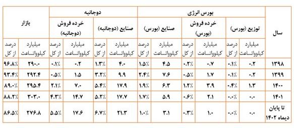 وی ادامه داد: در مقایسه با کل برق مصرفی کشور، در 10 ماه ابتدای سال جاری حدود 1.3درصد برق مصرفی از معاملات بورس انرژی و حدود 12.2درصد از طریق انعقاد قراردادهای دوجانبه تامین و مابقی مصارف یعنی حدود 86/5درصد از طریق بازار برق خریداری شد.