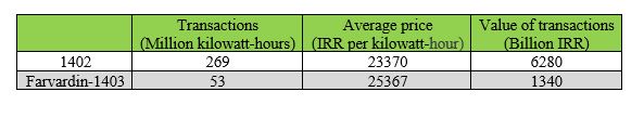 The transactions of green electricity produced by renewable power plants in the energy exchange, from the beginning of the establishment of the green electricity exchange (June-2024) until the end of 1402, were about 269 million kilowatt-hours with a value of about 6280 Billion IRR and an average price of 23370 IRR per KWH.